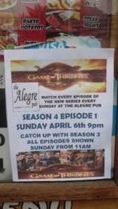 God bless the Alegre Pub for allowing me to keep my sanity and watch the season premiere of my favorite show the day that it actually airs. The previous season’s episodes were also shown… in Spanish. Kinda fun to hear things like, “Tu sabes nada, Jon Snow!”