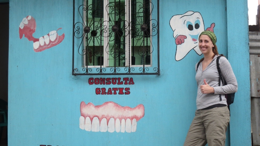 As we descended, the weather started to cool. By the time we walked through the town -seeing some awesome medical and dental clinic facades along the way- and back to the road, it was downright cold and a slight drizzle began to fall. I envied Dean, who had brought along his windbreaker, as we waited in vain for another shuttle. After a time, a truck approached us on the road. Domingo briefly consulted with the driver, and we hopped in the back of the truck bed. This is a totally typical event here in Central America: trucks with entire families in the back or, even more commonly, about 25 men standing and holding onto the added metal barriers, drive down the roads and highways. It’s just a more basic local version of a taxi or bus, yet it has still taken me a while to get used to seeing it, because that just does not happen where I’m from. Still, despite what felt like possible damage to my tailbone from my awkward sitting position on a corrugated plastic truck bed, the ride back to San Pedro was reeeeally fun.