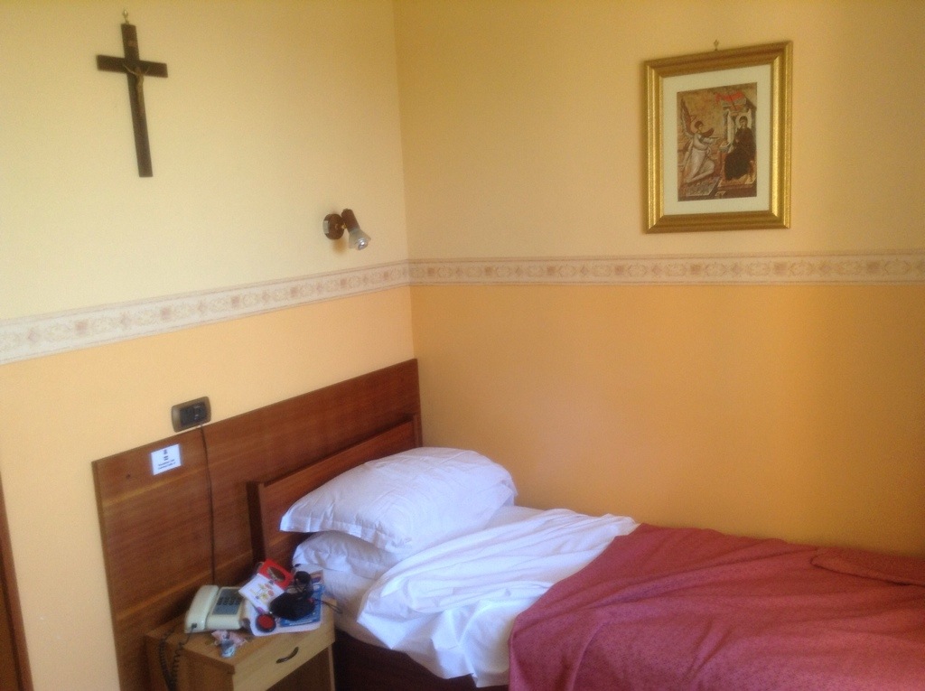 Once in Rome, I took several trains to reach the subway, which took me to the neighborhood where I would be staying the next four nights. I had booked a place online at booking.com (which, by the way, I quite like. They offer the option of looking for a single room for one person- including or excluding dorm beds in hostels depending on your preference- and frequently allow cancellation or changes in reservation at no cost). I had reserved the most reasonable accommodation I could find; no 10 Euro pilgrim albergues here! The place was a casa religiosa, which appeared to be a mix between a school and a seminary with conference rooms and a large chapel inside. When I reached my room and saw a crucifix and picture of the Annunciation on the wall, I smiled: it felt like I was still on the Camino.