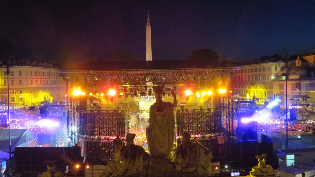 I had been in Rome 15 years earlier, so my goal was just to take it easy but see some of the sights that I had missed the first time around. My first night, I took the metro to the Spanish Steps and sat there eating a piece of pizza and a Coke. Gelato in hand, I wandered past cozy restaurant patios and came upon the Piazza Populo, where a MASSIVE free concert was going on. I was amazed at the relatively relaxed security: I was able to walk up the street behind the stage and watch the show from amidst the statues on the nearby hill. In the US, my guess is that the whole area would have been roped off and guarded, so I appreciated the opportunity for a good view!