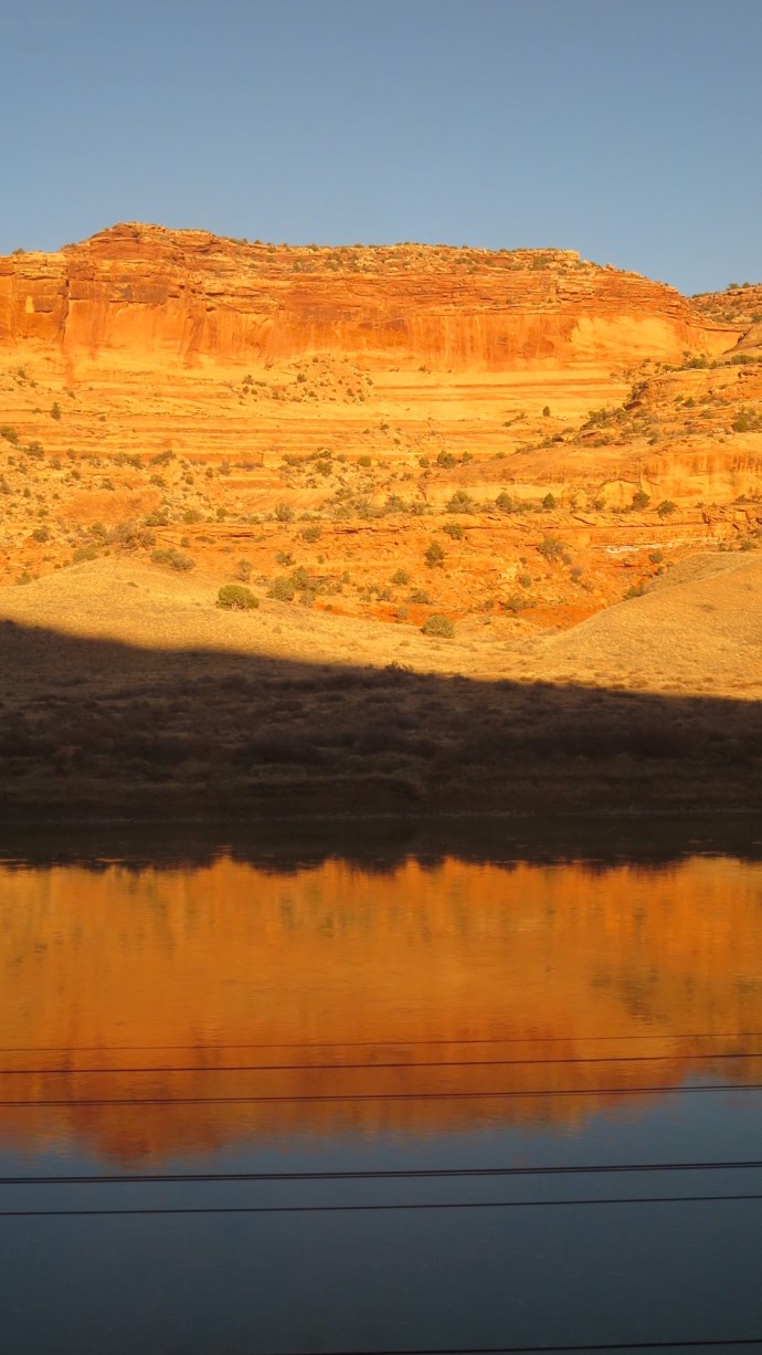Back aboard the train, we piled back into the observation car, where one of the Amtrak staff members was serving as a tour guide.  He knew the route like the back of his hand and pointed out all sorts of landmarks and interesting sites, from the hillside “graffitti” marking the border between Colorado and Utah to the rock formation known as the Three Sisters to the barely-visible rocky arch from Arches National Park in the distance. Also noted but not part of the official tour was a naked man hitting golf balls off a nearby plateau!