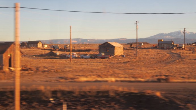 Slowly the snow began to dissipate as we approached Colorado’s western edge.  The gray peaks became a  blend of oranges and reds.We stopped for about half an hour for a streching break in Grand Junction while the train restocked and had a staff change.  I took this as an opportunity to check out the old station nearby and wander around the block.  Across the street, I could see a Pawn and Loan with snowy peaks in the distance.  The dilapidated old station was a sad sight:  what was once a beautiful structure had fallen into severe disrepair over the last 40 years.  The art deco arches were crumbling, the old Pufferbelly Station sign was faded and chipping, and wooden boards had been nailed behind the jagged glass of the windows.  I overheard someone say that the property was $300,000 to buy but would cost over $1 million to renovate.  Although it seems doubtful now, I hope that someday the station can be restored to its historic grandeur.