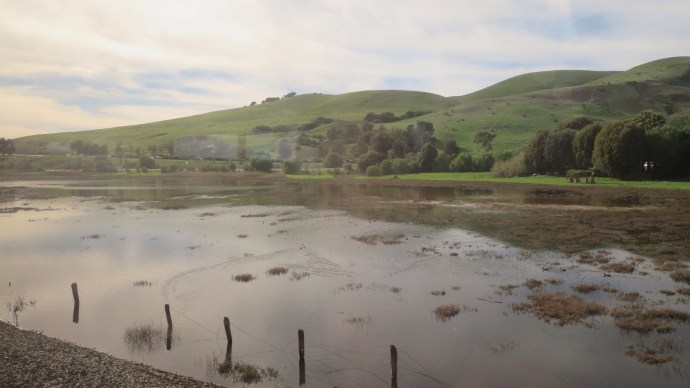 The fields soon became logged (haha, see what I did there?) with water, and entire roads alongside the tracks looked impassable.  A house made of wooden planks with a sign saying “BANJO LESSONS HERE” stood on stilts over the marshy ground outside of Davis, CA.