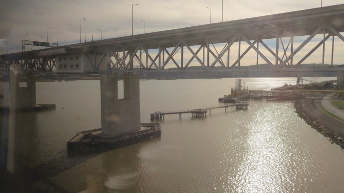 Before too long, the first glimpses of the coast came into view.  The tracks abutted the shoreline, and we crossed the bridge into Martinez, the last major stop before Emeryville.