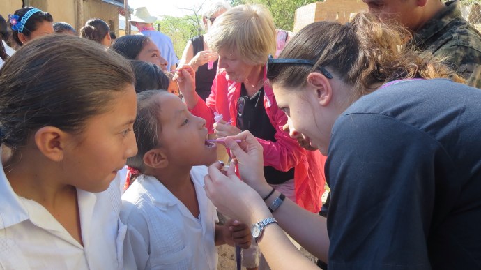 Once our home care instructions were done, we split up into teams to apply fluoride varnish to the kids’ teeth. This went quickly because we had so many volunteers from our group helping out.