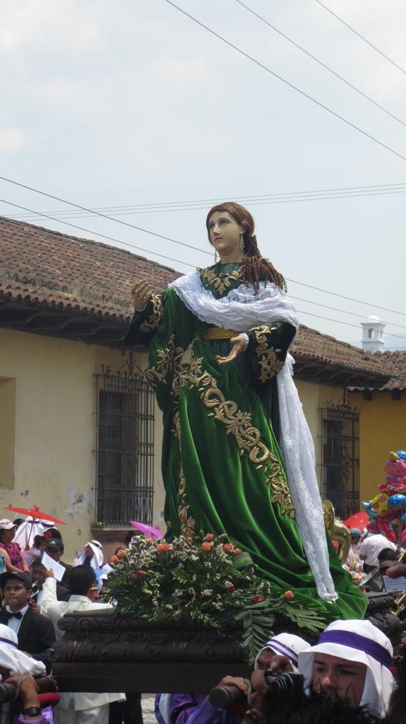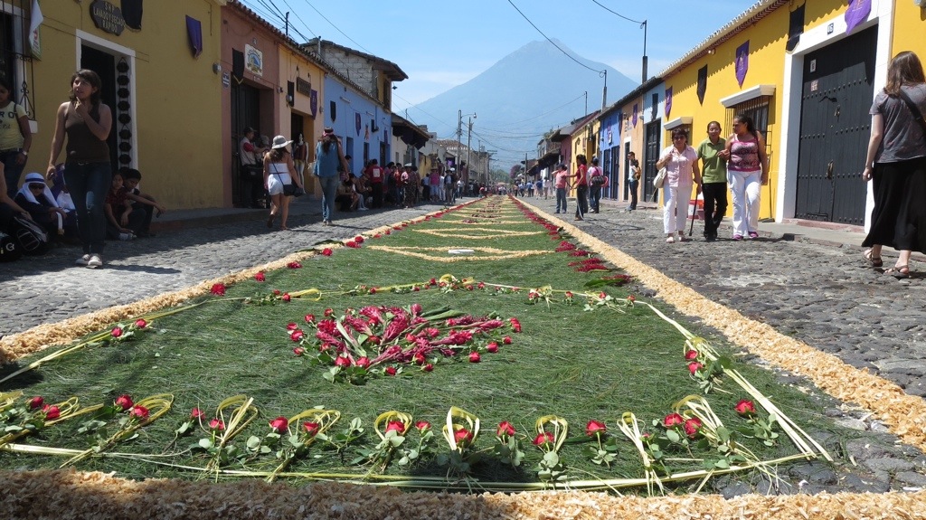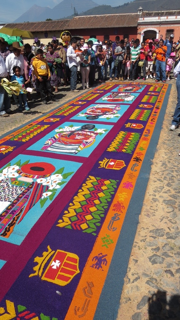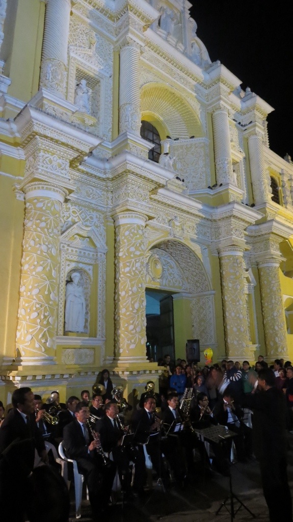 Megan and I had originally planned to hike the volcano Pacaya on Saturday, but as she had only arrived in town at 6am and was dead tired, and I was suffering from a painful lump on the top of my left foot (I know, the random ailments continue), we decided to just take it easy and enjoy the ambience of Antigua for the weekend. Antigua Guatemala is a Spanish colonial town, not unlike Granada in Nicaragua, and it was absolutely abuzz with locals and tourists alike for the beginning of Semana Santa, or Holy Week. I had read about the popular processions involved with this week, but never did I expect anything so elaborate. The entire week, there are outdoor festivals and displays in the churches, streets covered in flowers, and bands playing sacred music.
