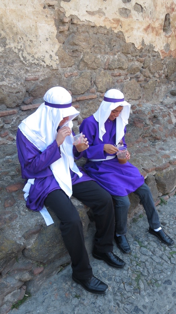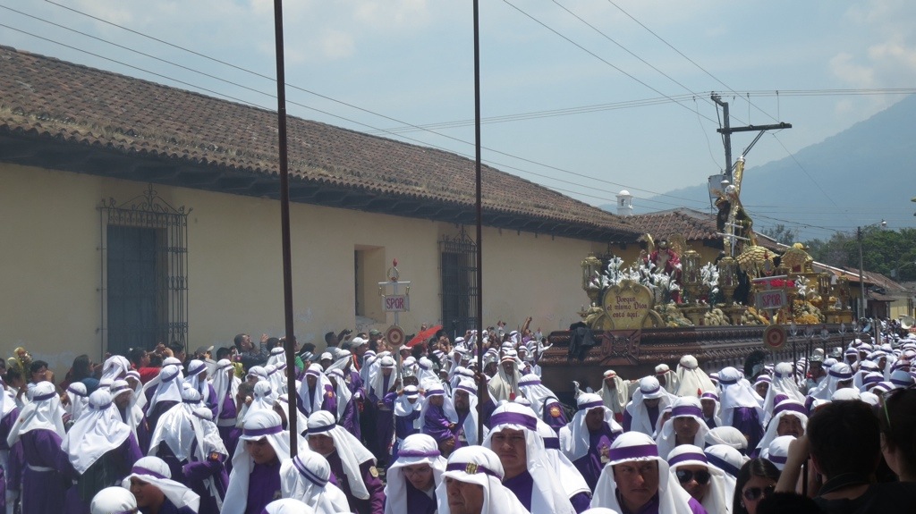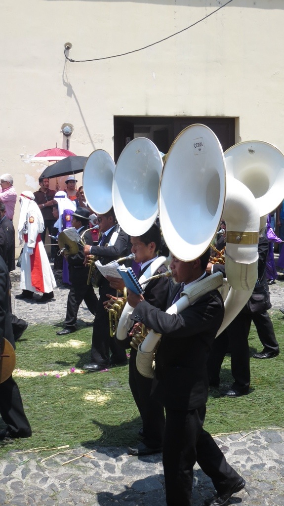Most processions that I saw followed the same standard: men and boys with matracas pave the way, followed by younger boys with incense and men in purple robes, the cargadores or cucuruchos, who take turns bearing the weight of the enormous andas of the procession. (I have read that some of these can weight up to 4 tons). There is always a lead cargador in white who stands at the head of the anda, steering and controlling the speed of the group. The first anda is followed by a band and then by a second, smaller anda with the Virgin Mary, which is carried by female cargadoras in white blouses and black skirts. After the second band comes the clean-up crew, which efficiently scoops up the alfombras of flowers, which the townspeople worked all night to create.