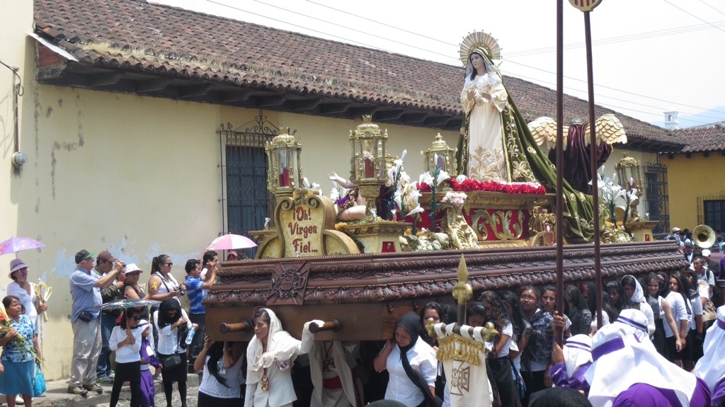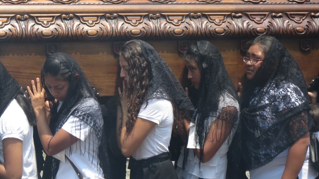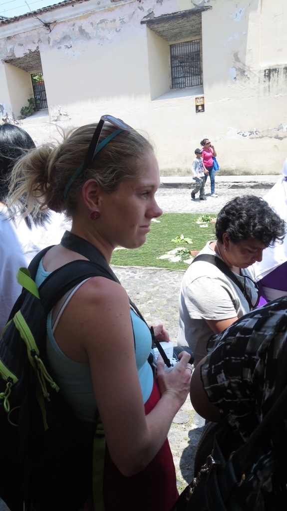 Megan and I picked up coffee and bread for a mini-breakfast and went to Iglesia La Merced, the main cathedral, on Sunday morning for Palm Sunday Mass. Unfortunately, I got the times wrong, and by the time we arrived, the service had already started, and the church was packed with people. We were able to squeeze in to get some standing room, but about halfway through, the lack of space and air started to affect me. I was getting visions of my preteen days when I constantly felt faint during Mass… and then I started seeing stars. I needed to get out of there. The outside of the church wasn’t much better: stifling heat, massive crowds of people, and a myriad of street vendors. (This merits a quick comment on the festivities: while I understand that most of the vendors are there to feed the throngs of people who come to watch the processions, it did feel a little strange to see men selling motorized helicopters and Dora the Explorer or Minion balloons at a religious event. It made me think a lot about the distinction between what is “religious” and what is “cultural”).